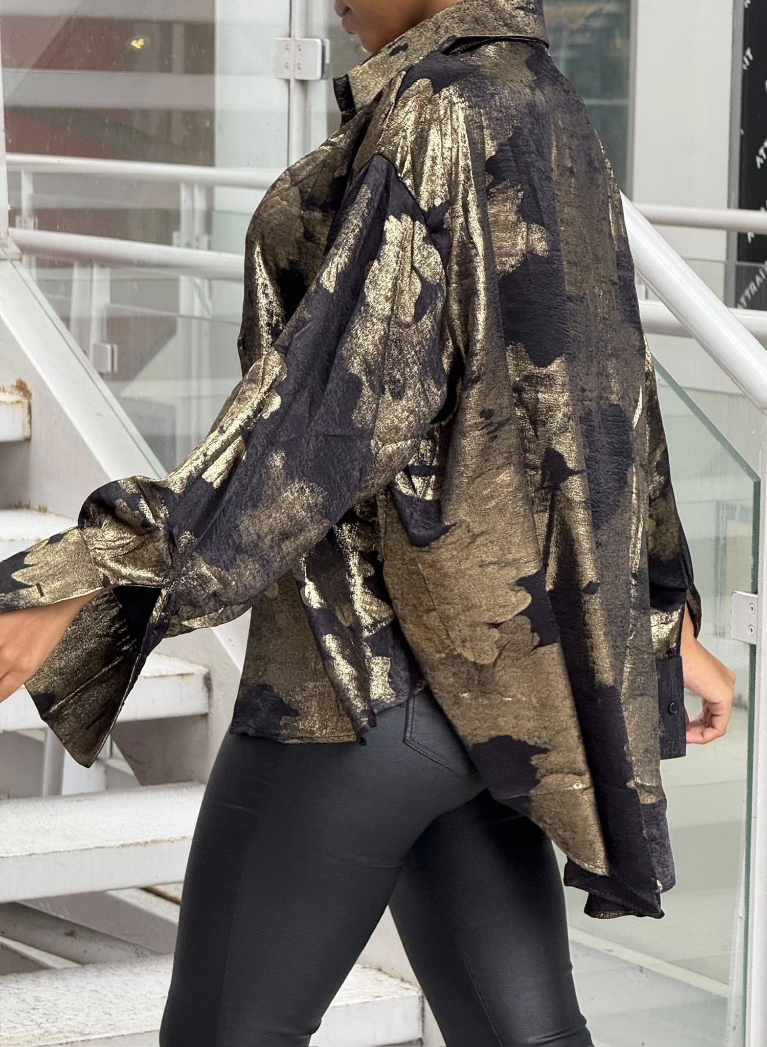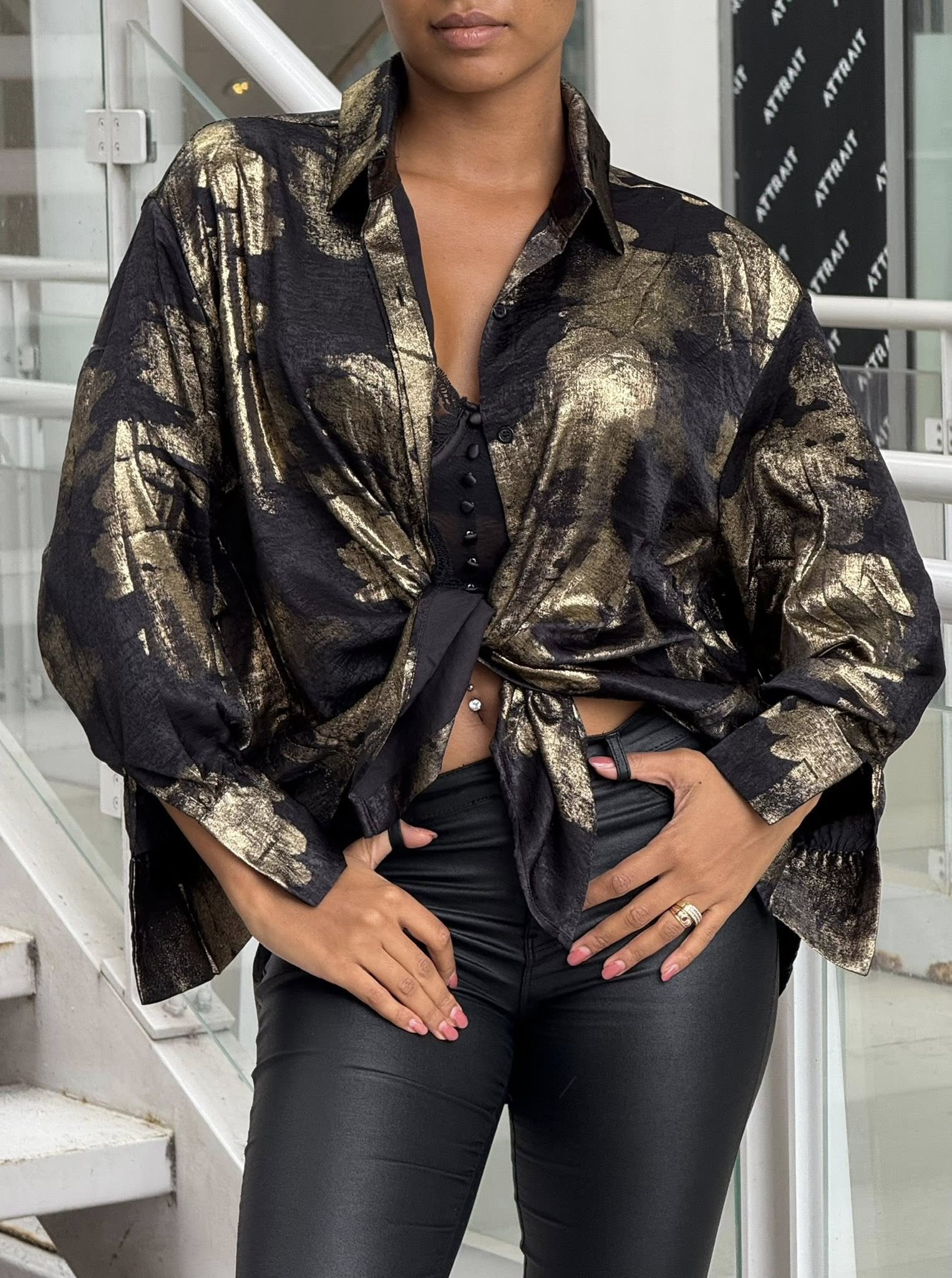 Chemisier satiné noir aux éclats dorés – Taille unique convient jusqu’au 46