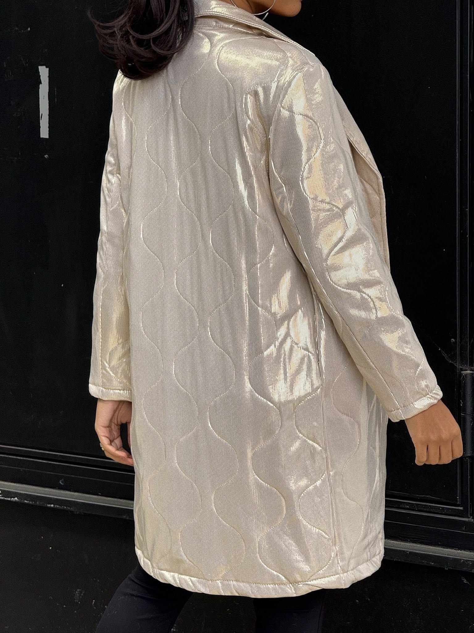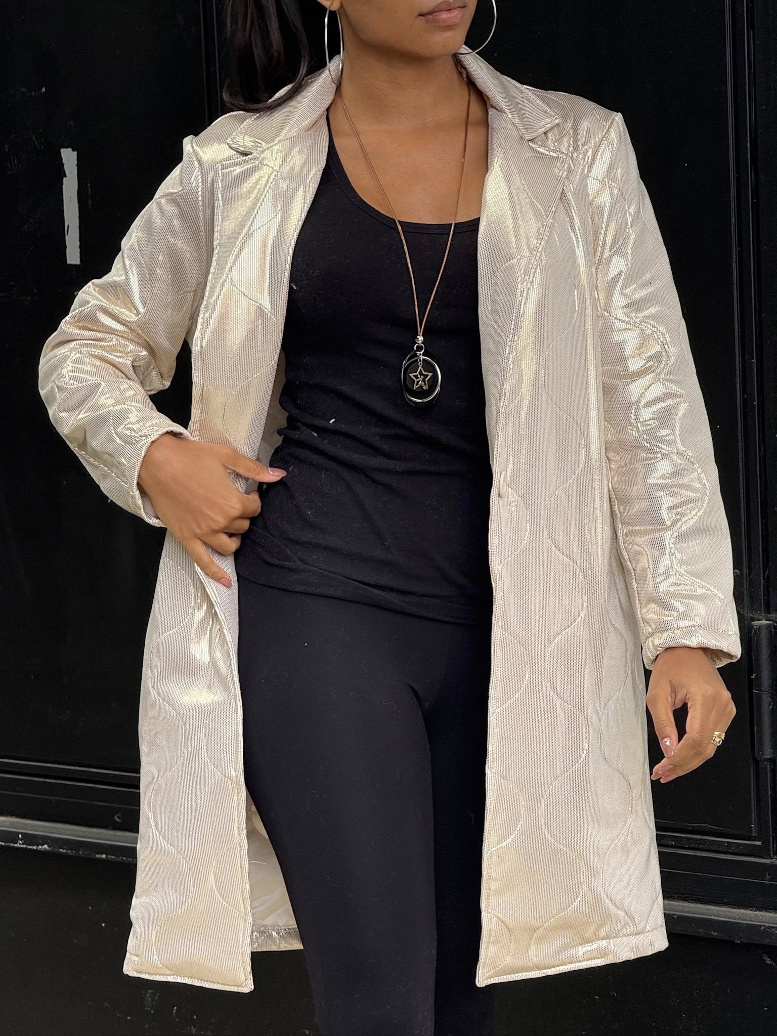 Manteau long beige à effet métallisé mi-saison ou pour sublimer une tenue de soirée