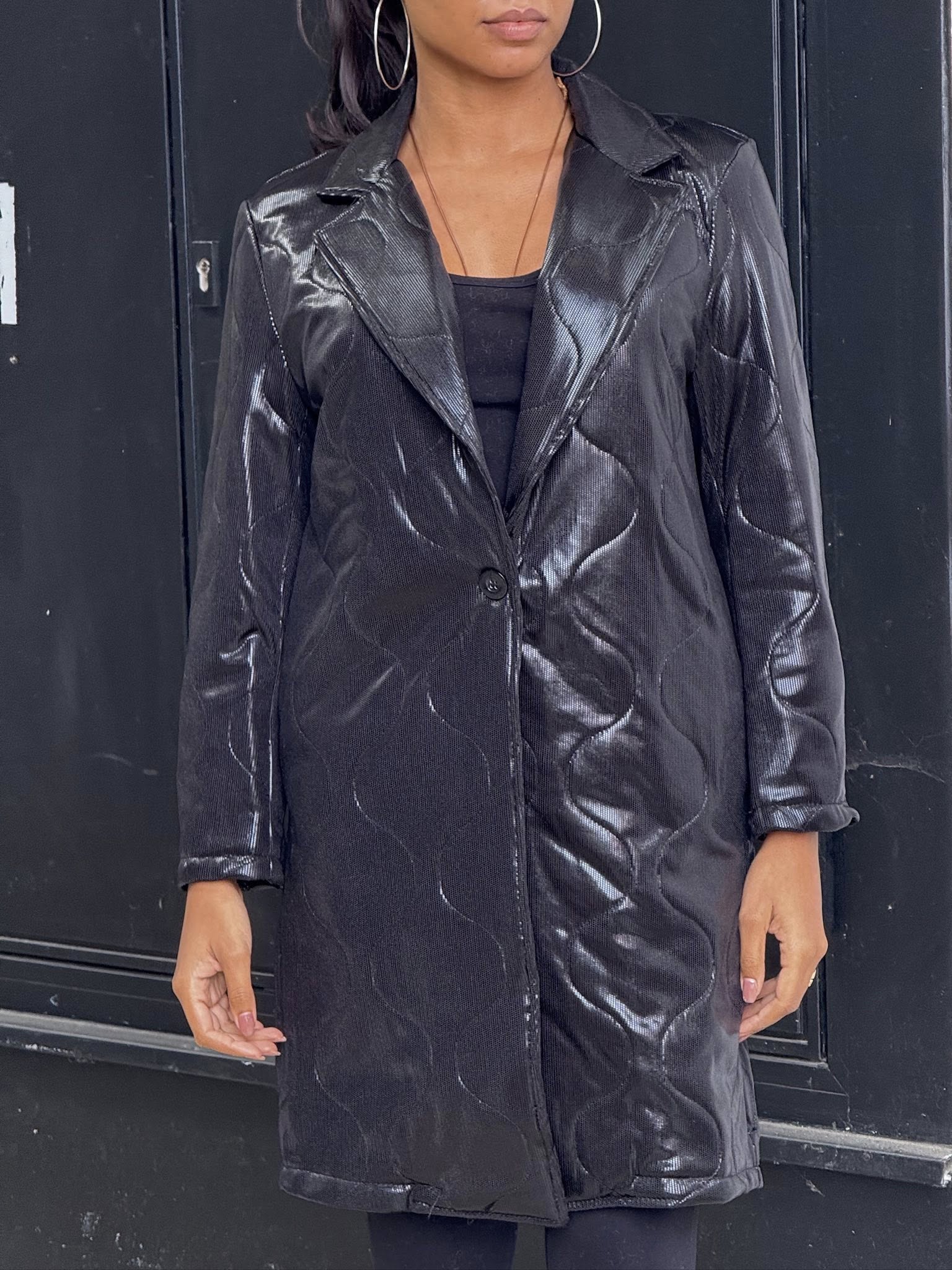 Manteau long noir à effet métallisé mi-saison ou pour sublimer une tenue de soirée